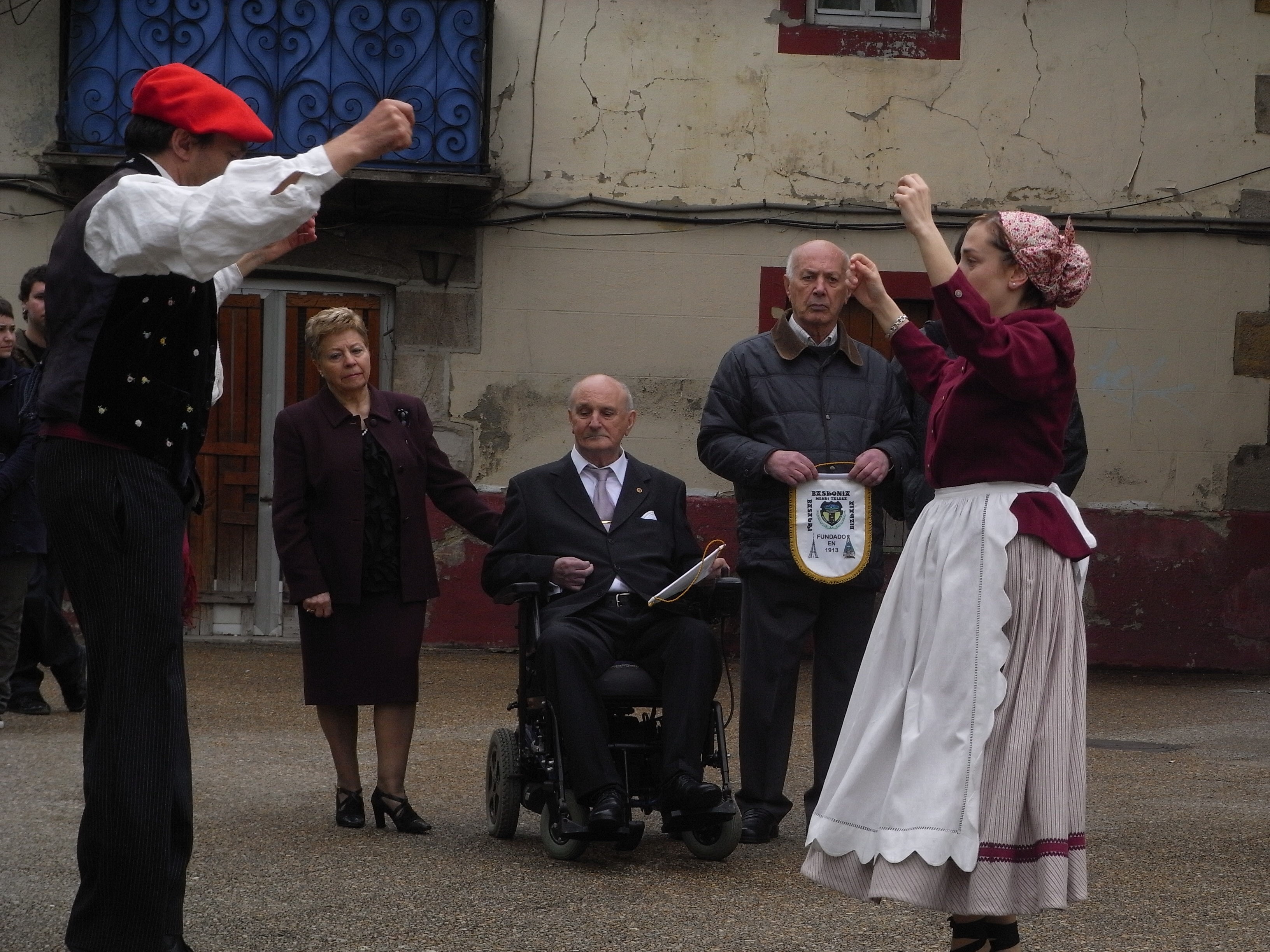 – En el homenaje participan dantzaris del grupo Argintzari así como txistulari y txalapartaris que acompañaron en el acto.